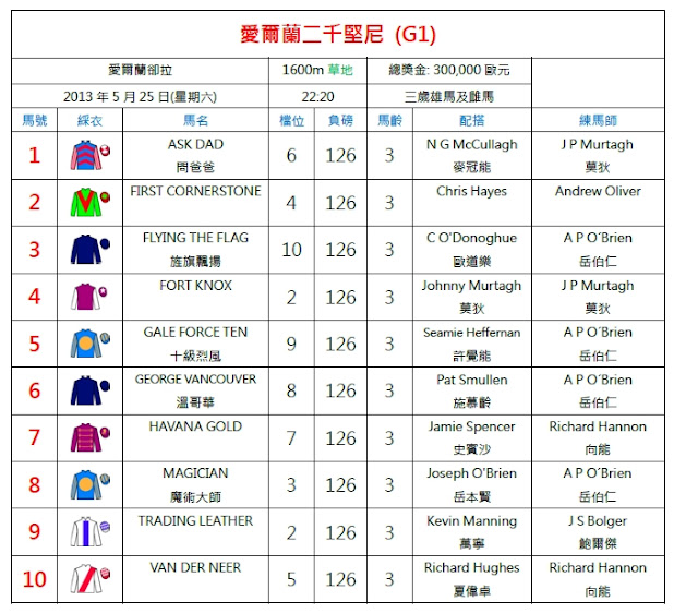 標題: 愛爾蘭一級賽--愛爾蘭二千堅尼 愛爾蘭 卻拉 1600m 草地 三歲雌雄