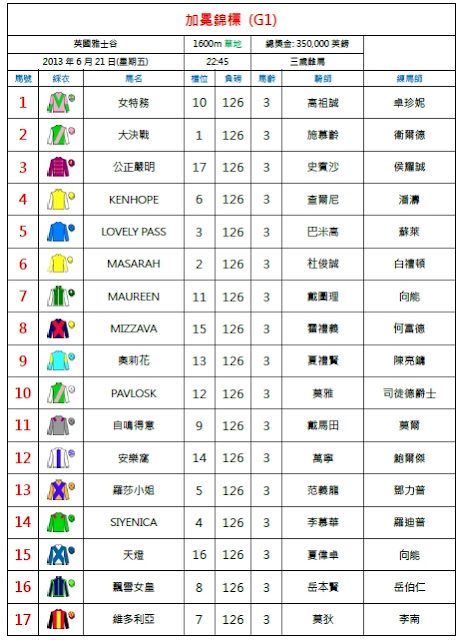 英國一級賽 - Coronation Stakes 雅士谷 3歲雌 草 1600m